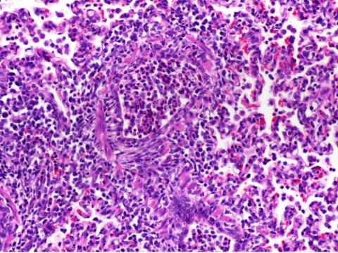 病理スライド11:肺胞壁の肥厚と肺胞腔内に細胞浸潤が認められた。